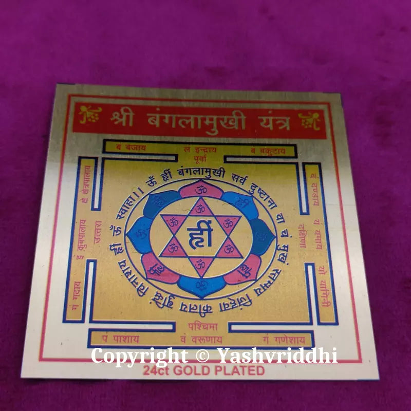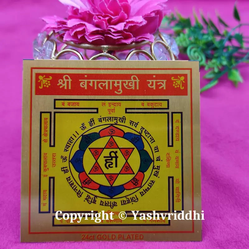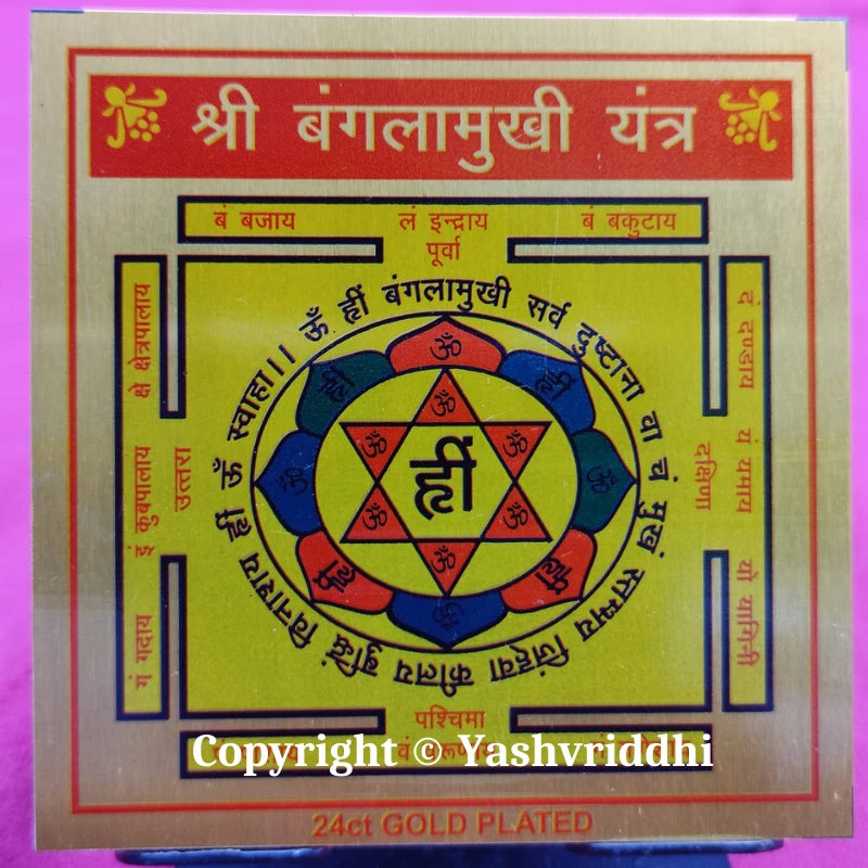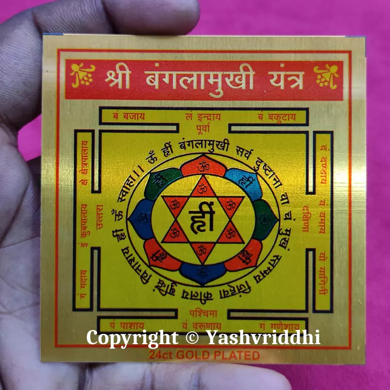 The Shree Baglamukhi Yantra is a sacred emblem representing Goddess Baglamukhi, embodying her power to overcome enemies and obstacles. By meditating on or displaying the Shree Baglamukhi Yantra, one seeks blessings for protection, victory, and control. It resonates with the energies of control and dominance, aiding in facing challenges and negating adversarial forces. This yantra holds transformative powers, aligning with Goddess Baglamukhi's potent energies, fostering inner strength and invoking her divine intervention. It acts as a conduit for Baglamukhi's energy, nurturing a life imbued with confidence, success, and the ability to overcome all forms of opposition.