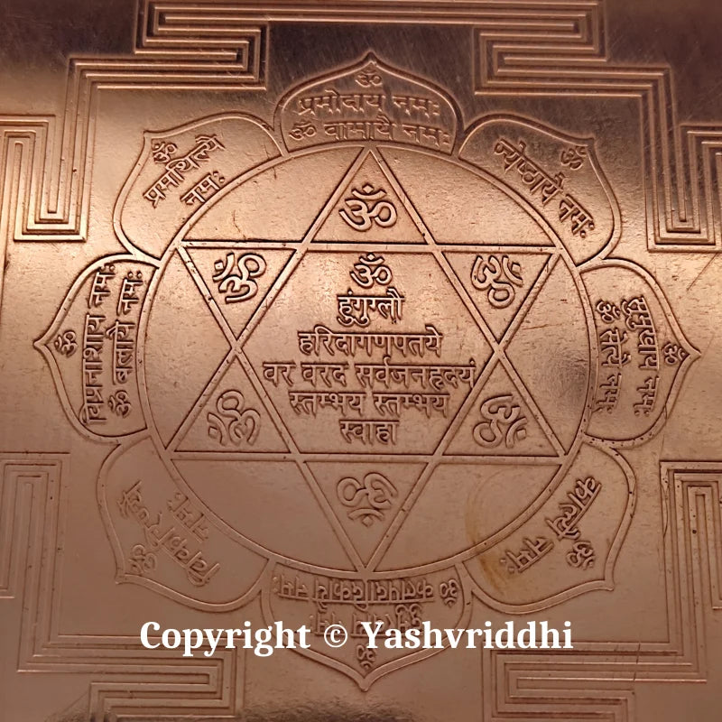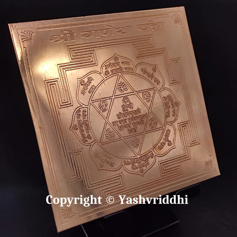The Yantra itself is a geometric design, meticulously crafted with precision, and often etched or embossed on a metal plate. Its form incorporates sacred symbols, including the image of Lord Ganesha, as well as specific mantras and geometric patterns that resonate with the vibrational frequency associated with the deity. The overall design is rooted in ancient Hindu scriptures and sacred geometry, aligning with the principles of cosmic order and divine harmony.