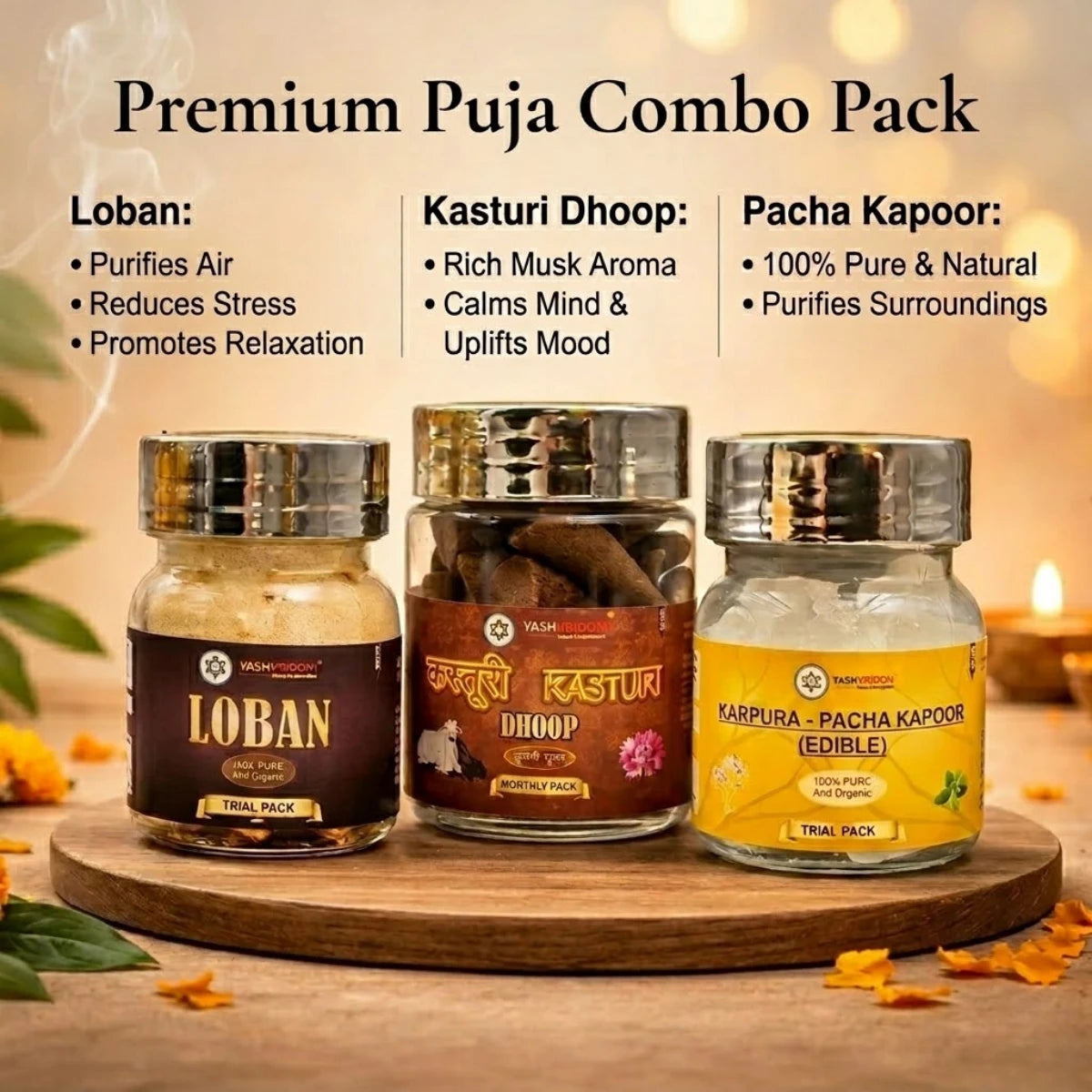 Bring home a complete spiritual experience with this Premium Puja Combo Pack, thoughtfully curated to elevate your daily rituals and meditation practices. This combo includes Pure Loban (20g Trial Pack), Kasturi Dhoop Cones (50g Monthly Pack), and Pacha Kapoor Edible Camphor (20g Trial Pack) - each known for its unique aromatic and purifying properties.