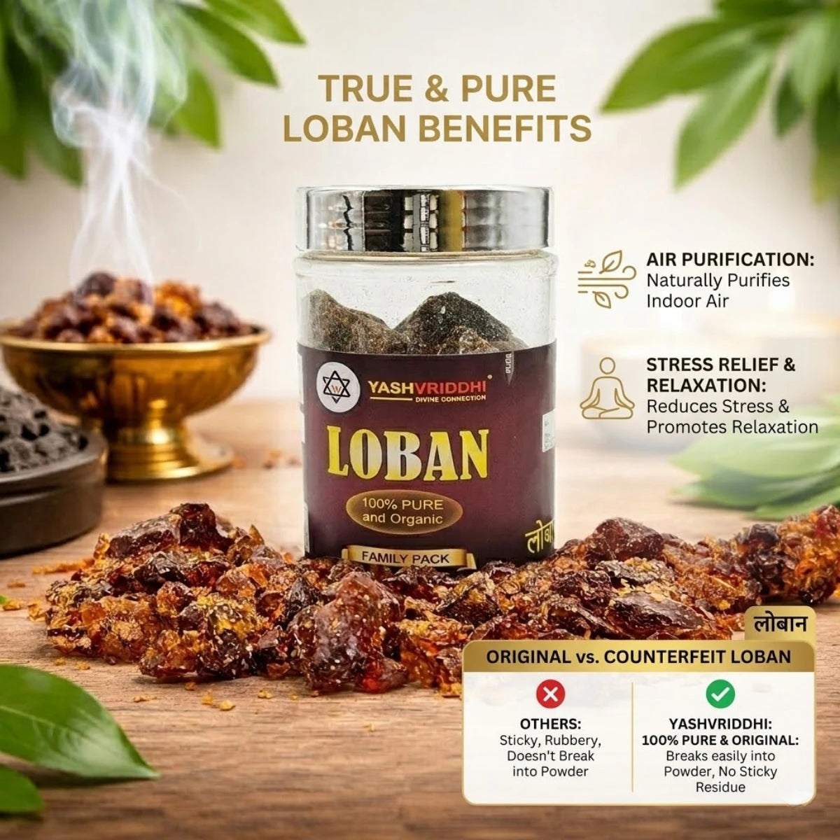 This is Original Loban (Gum Benzoin) in its raw, crystalline form. We guarantee its purity with the "Glass Test": true, pure Loban Resin shatters like glass when crushed. A staple in Pooja Samagri since ancient times, Loban Dhoop is renowned for cleansing the environment and removing negative energies. Burn it on cowdung in a traditional Loban Dani to release its potent, purifying smoke.