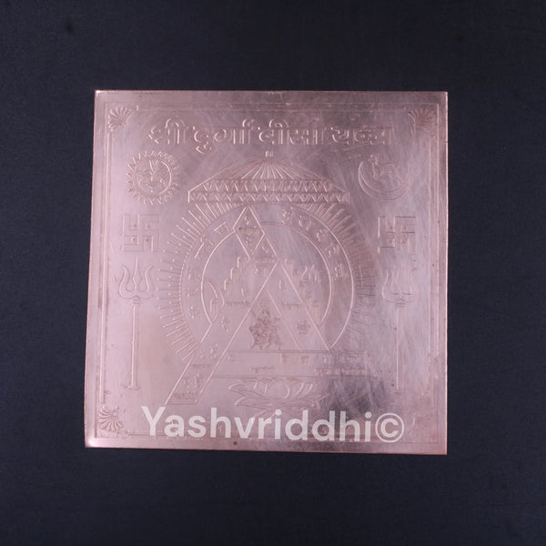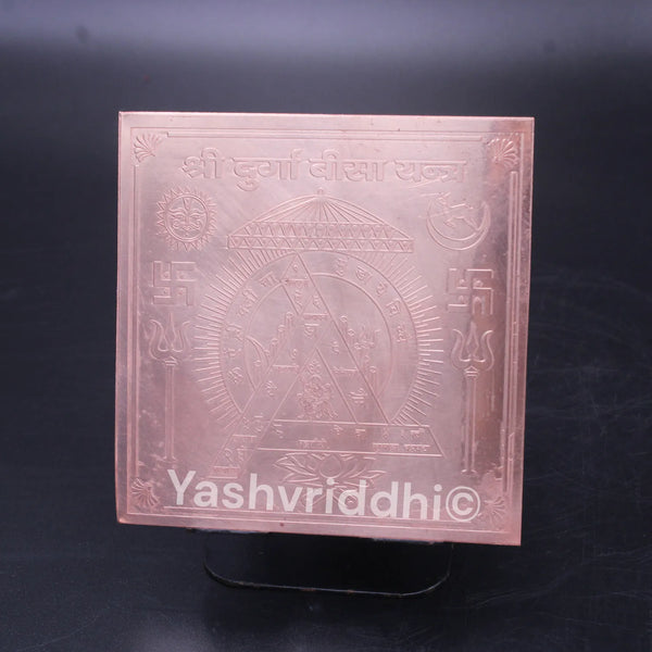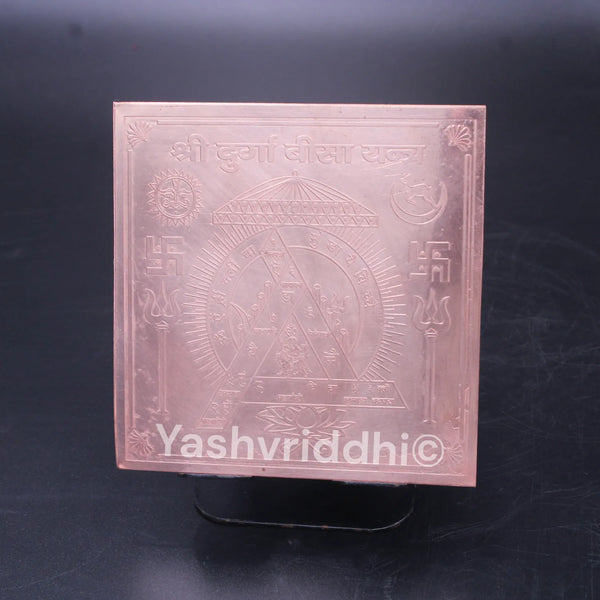 The Copper Shree Durga Bisa Yantra is one of the most powerful and auspicious yantras dedicated to Goddess Durga. It is believed to remove obstacles, protect from negative energies, and bring success in every sphere of life. Crafted on a pure copper plate with sacred geometric designs, this Yantra symbolizes divine energy and blessings of Maa Durga. It is especially recommended for protection, prosperity, and fulfillment of desires.