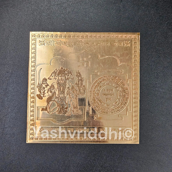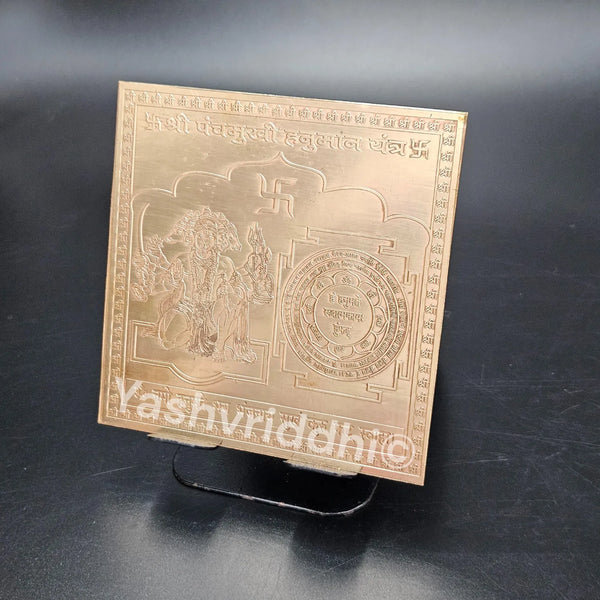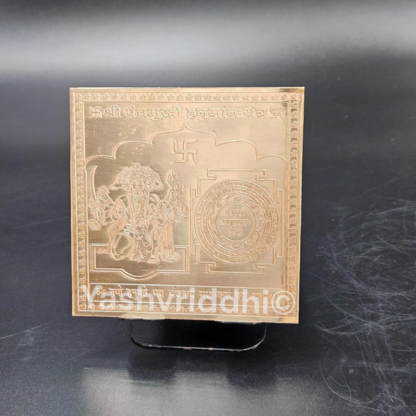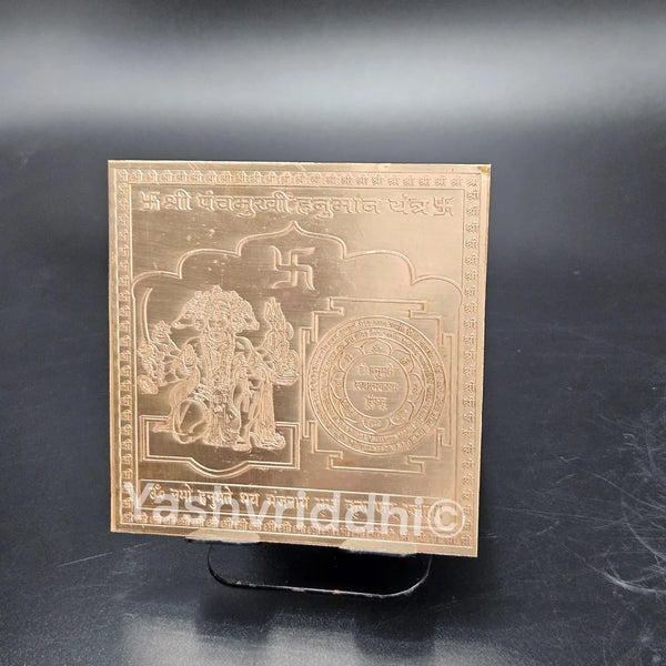 The Panchmukhi Hanuman Yantra is a highly powerful and protective yantra that invokes the blessings of Lord Hanuman in his five-faced (Panchmukhi) form. Crafted from premium-quality copper plate, this 4-inch yantra radiates divine energy, offering strength, courage, protection, and victory over enemies. It is especially beneficial for removing negative energies, fears, black magic, and vastu doshas while ensuring peace and success.