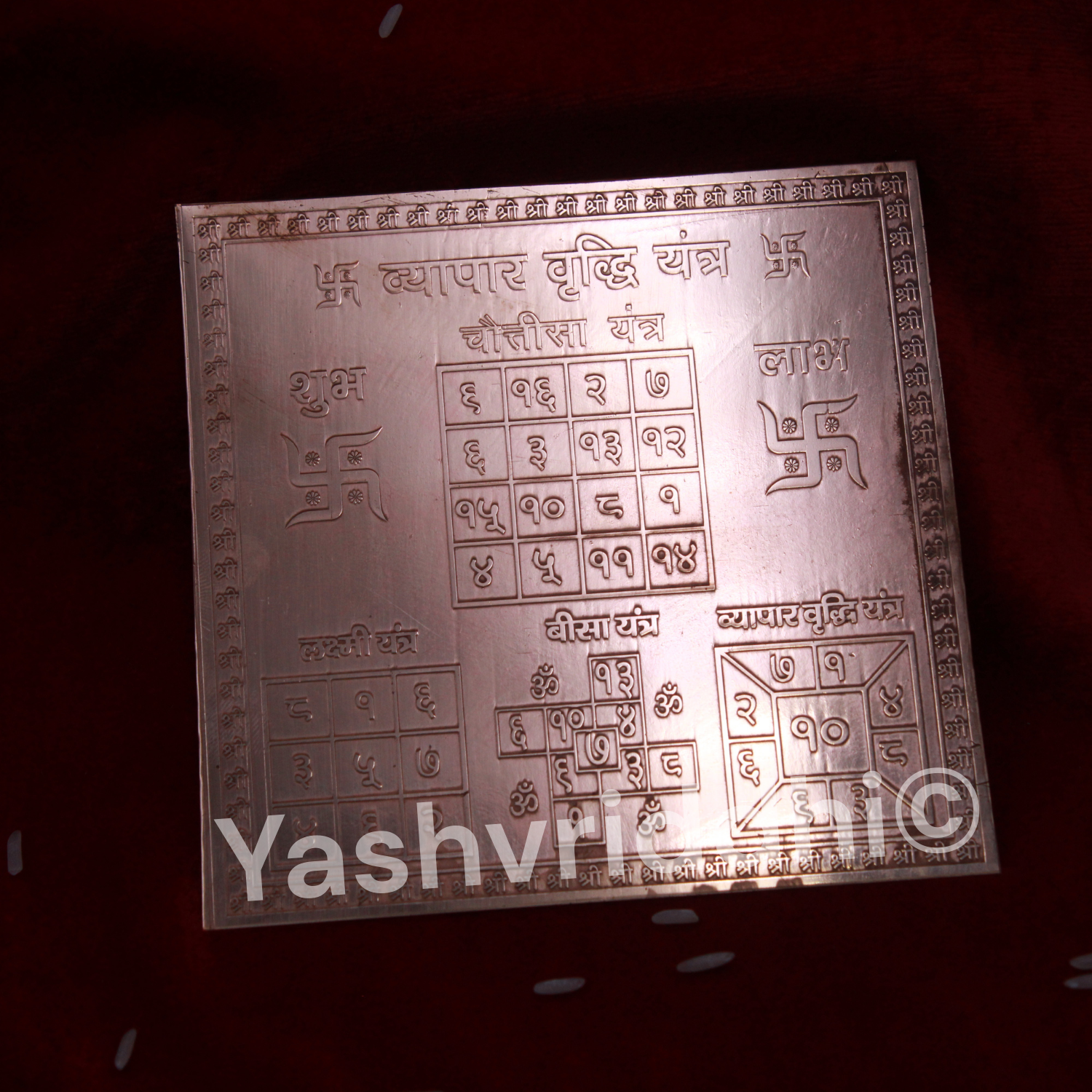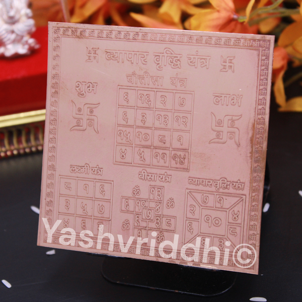 मंत्र: ओम आकरष्य स्वाहा, ऊँ गं गणपतये नमः! ओम श्री महा लक्ष्म्यै नमः मंत्र: ॐ आकरष्य स्वाहा, गण गणपत्ये नमः, ॐ श्री महा लक्ष्म्यै नमः 4 x 4 इंच शुद्ध तांबे का यंत्र प्रतिनिधित्व करता है: भगवान गणेश और देवी लक्ष्मी उद्देश्य: अच्छे भाग्य, प्रसिद्धि और आय/धन/लाभ में सुधार के लिए व्यापार वृद्धि यंत्र सबसे शुभ यंत्रों में से एक है। यह यंत्र देवी लक्ष्मी, भगवान गणेश और भगवान कुबेर की संयुक्त पूजा के लिए है। जहां भगवान गणेश सफलता के देवता हैं और देवी लक्ष्मी धन और समृद्धि की देवी हैं। यंत्र को उचित ऊर्जाकरण और प्राण प्रतिष्ठा के बाद भी खरीदारों तक पहुंचाया जा सकता है इसलिए, जो लोग इच्छुक हैं, वे भी इस पृष्ठ पर जाएं और इस यंत्र के साथ सक्रियण के लिए अलग से फॉर्म भरें, ताकि यंत्र के प्रेषण से पहले उनके नाम पर उचित ऊर्जावान और प्राण प्रतिष्ठा की जा सके। यंत्र की सक्रिय प्रक्रिया के लिए आवश्यक चीजें – एक विशिष्ट प्रार्थना – इस पृष्ठ पर जाएँ – पंचगव्य (घी, गंगाजल, दूध, दही, शहद) – कोई भी एक फल का रस (नारियल का पानी, गन्ने का रस, अनार का रस) यंत्र की अभिषेक प्रक्रिया भक्त अपनी सुविधानुसार सप्ताह में एक या दो बार यंत्र का अभिषेक कर सकते हैं और यंत्र की अभिषेक प्रक्रिया का विस्तृत विवरण नीचे दिया गया है – पवित्र जल से यंत्र को स्नान कराएं – एक-एक करके सभी अभिषेक द्रव्य अर्पित करें जो पंचगव्य (जल, दूध, दही, घी, शहद) और कोई भी एक फल का रस (नारियल का पानी, अनार का रस, गन्ने का रस) हैं – अब एक साफ कपड़े से यंत्र को पोंछें और इसे आसन पर रखें यंत्र की पूजा प्रक्रिया के लिए आवश्यक सामग्री – गंगाजल – साफ कपड़ा – चंदन का पेस्ट – तुलसी का पत्ता – धूप और अगरबत्ती – मिठाइयाँ, फल और अन्य खाने योग्य – यंत्र को धातु की प्लेट पर रखें – पूर्व दिशा की ओर मुख करके बैठें – यंत्र को गंगाजल से स्नान कराएं – इसे साफ कपड़े से पोंछें – यंत्र पर चंदन का टीका लगाएं और यंत्र पर तुलसी का एक पत्ता रखें ताकि तुलसी यंत्र पर अच्छी तरह से टिकी रहे – भगवान/देवी के मंत्र का जाप करें – यंत्र को धूप/अगरबत्ती दिखाएं – यंत्र को कुछ मिठाई, फल और अन्य खाद्य पदार्थ अर्पित करें – यंत्र के सामने अपनी इच्छा जोर से बोलें।