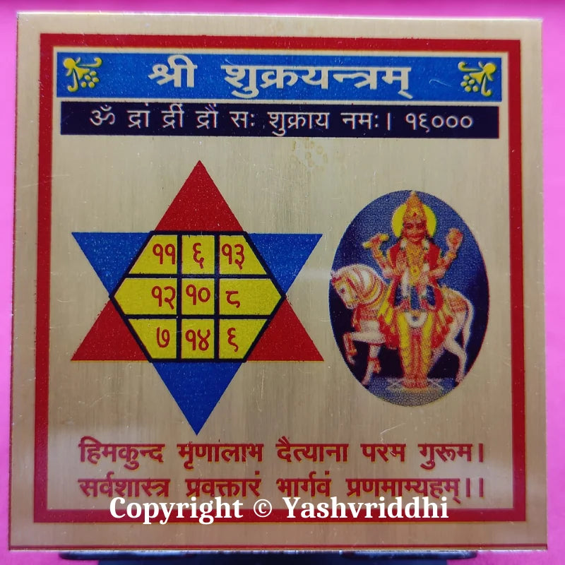 The Shree Shukra Yantra is a revered emblem representing the planet Venus (Shukra) in Vedic astrology. It harnesses Venus' energies of love, beauty, and creativity. By meditating on or displaying the Shree Shukra Yantra, one seeks blessings for harmonious relationships, artistic expression, and material well-being. It resonates with the energies of refinement and elegance, promoting aesthetic appreciation and emotional balance. This yantra holds transformative powers, aligning with Venus' positive influences, enhancing personal charm, and guiding one's path towards love and prosperity. It acts as a conduit for Venus' blessings, fostering a magnetic aura and a sense of joy in life.